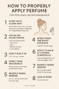 Perfume should smell pleasant, not overpowering. A couple of sprays are enough. You want people to notice when they’re near you, not from across the room.